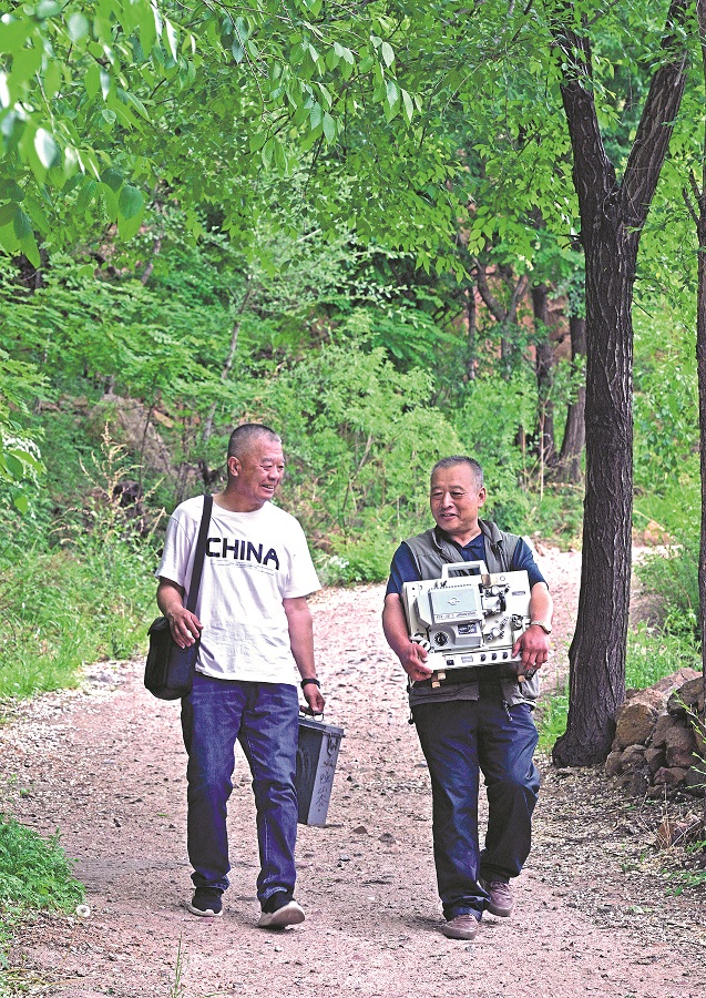 Zhou (right) and a colleague carry a projector and a film copy for a screening on June 20. LIU TONG/WANG ZHONGXUN/DATONG DAILY